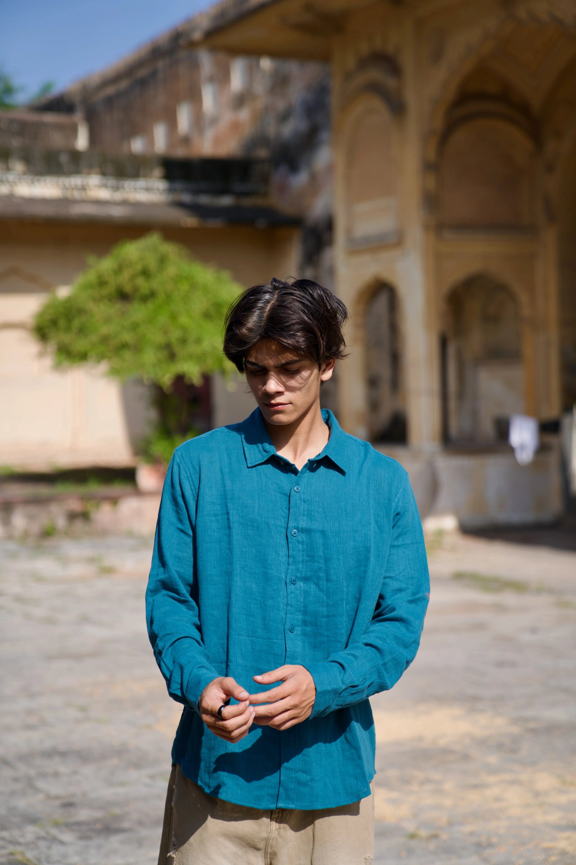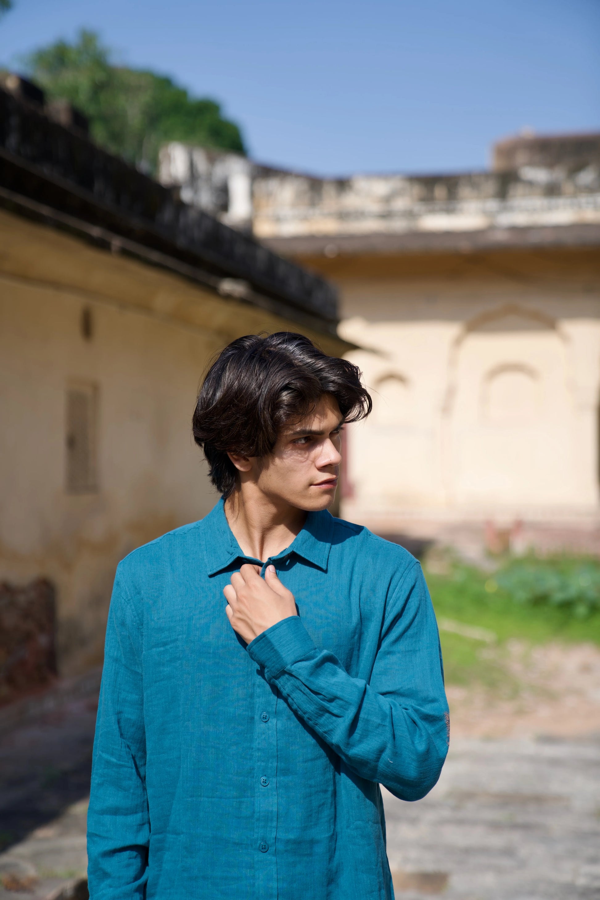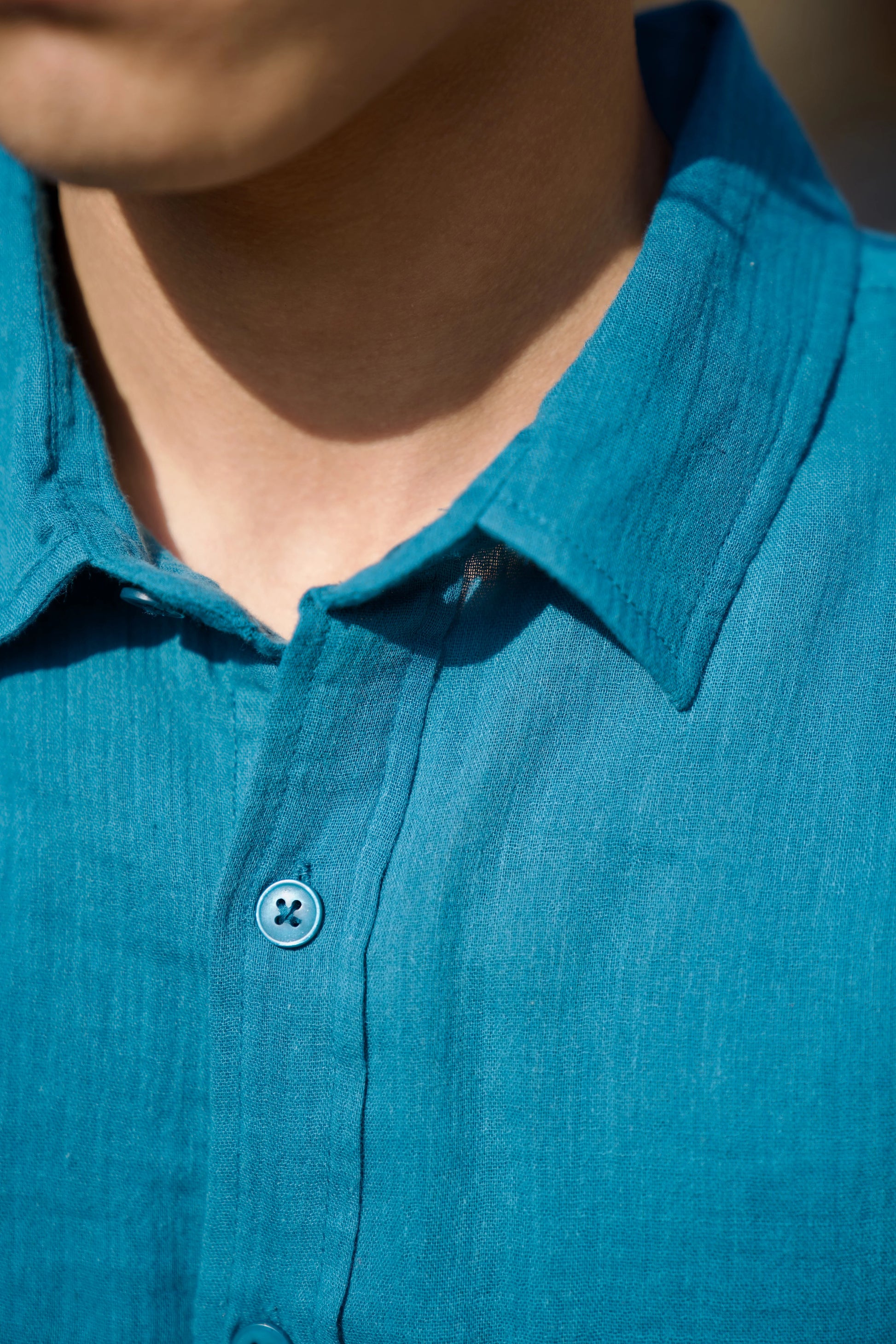 - Occasion: Whether it’s for work, travel, or leisure, the Teal Crinkle Gauge Shirt is your perfect blend of refined elegance and everyday practicality.